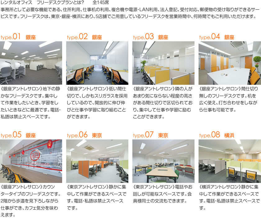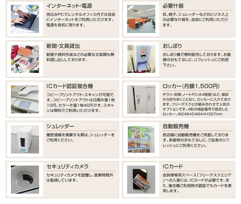 机、椅子、シュレッダーなどのビジネス上の必要な什器を、自由にご利用いただけます。 |