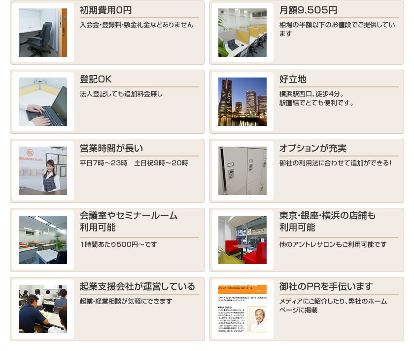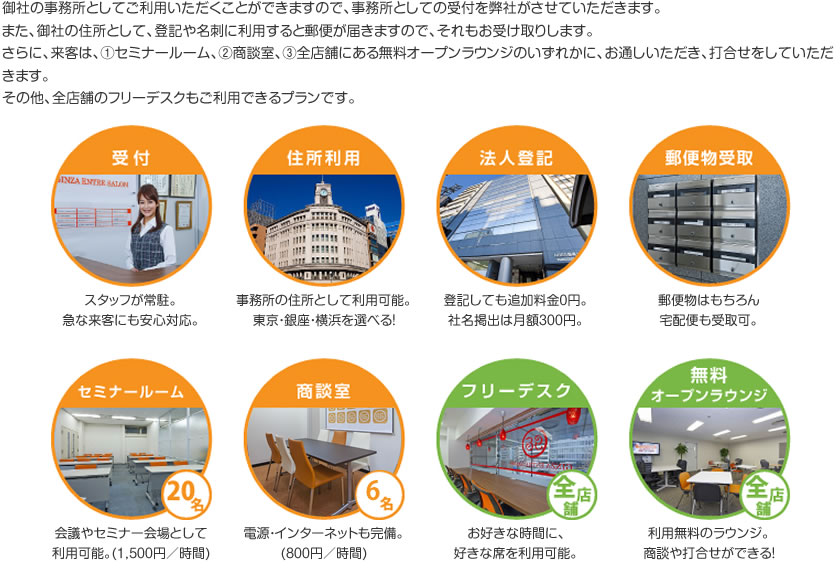 | 社名掲出 | 月額料金:300円 貴社の社名をオフィス受付に掲示致します。 |
